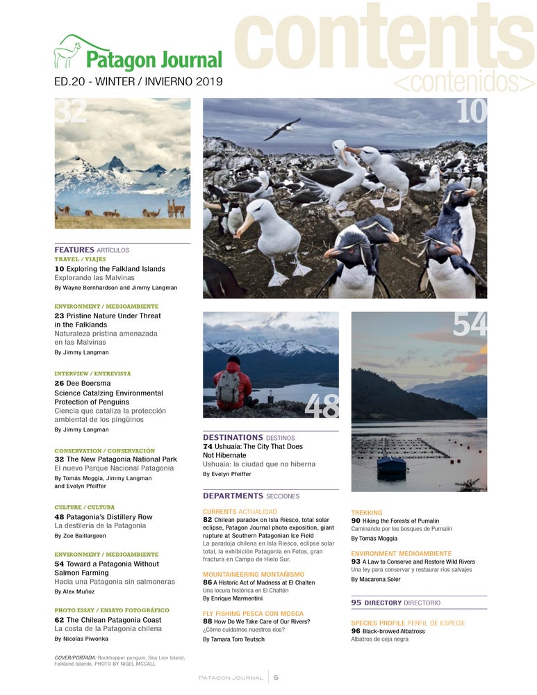 In our cover story, Wayne Bernhardson and Jimmy Langman write about travel in the Falkland Islands. A naturalist’s paradise, millions of penguins and diverse birds and marine mammals are in abundance. Jimmy Langman also writes about environmental threats to wildlife in the Falklands. Also in this issue, an in-depth story about the new Patagonia National Park, an interview with penguin scientist Dee Boersma, a report on Patagonia liquors, the threats from salmon farming, a travel destination article about Ushuaia, and much more.