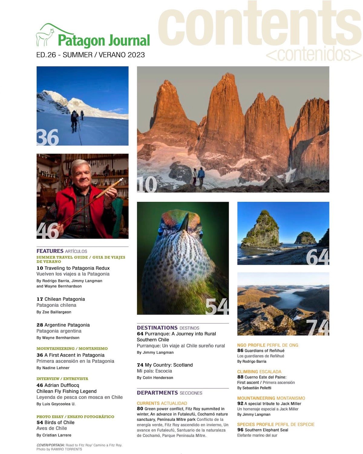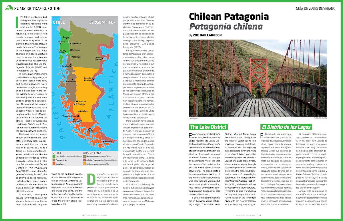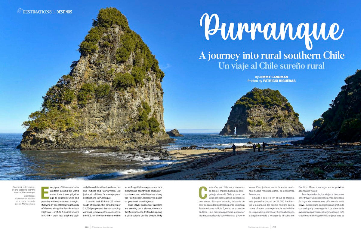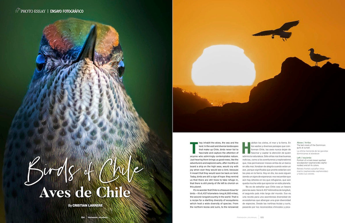 In this edition, we feature our first ever Patagonia Summer Travel Guide, written by accomplished travel writers Zoe Baillargeon and Wayne Bernhardson. We also have an extensive story by Nadine Lehner about the first all-female expedition to the Northern Patagonia Ice Field; an interview with Chilean fly fishing legand, Adrian Dufflocq; a spectacular photo essay of the birds of Chile by the photographer Cristian Larrere; an in-depth look at rural travel and the pristine coast in Purranque; and much, much more.