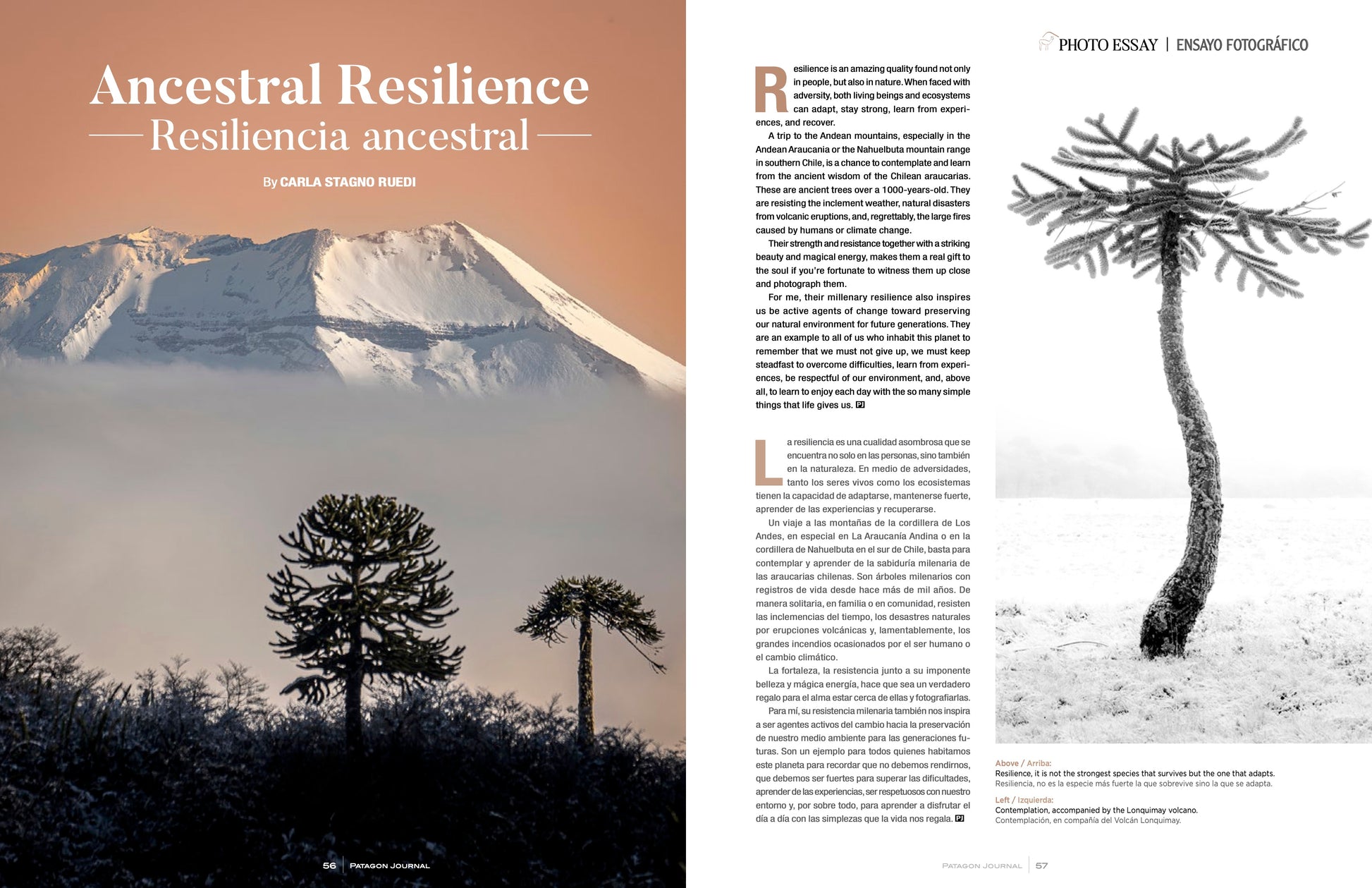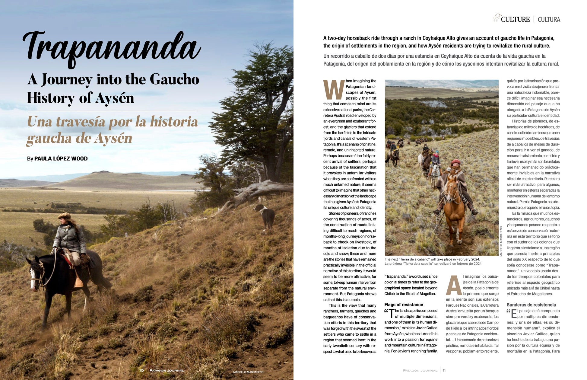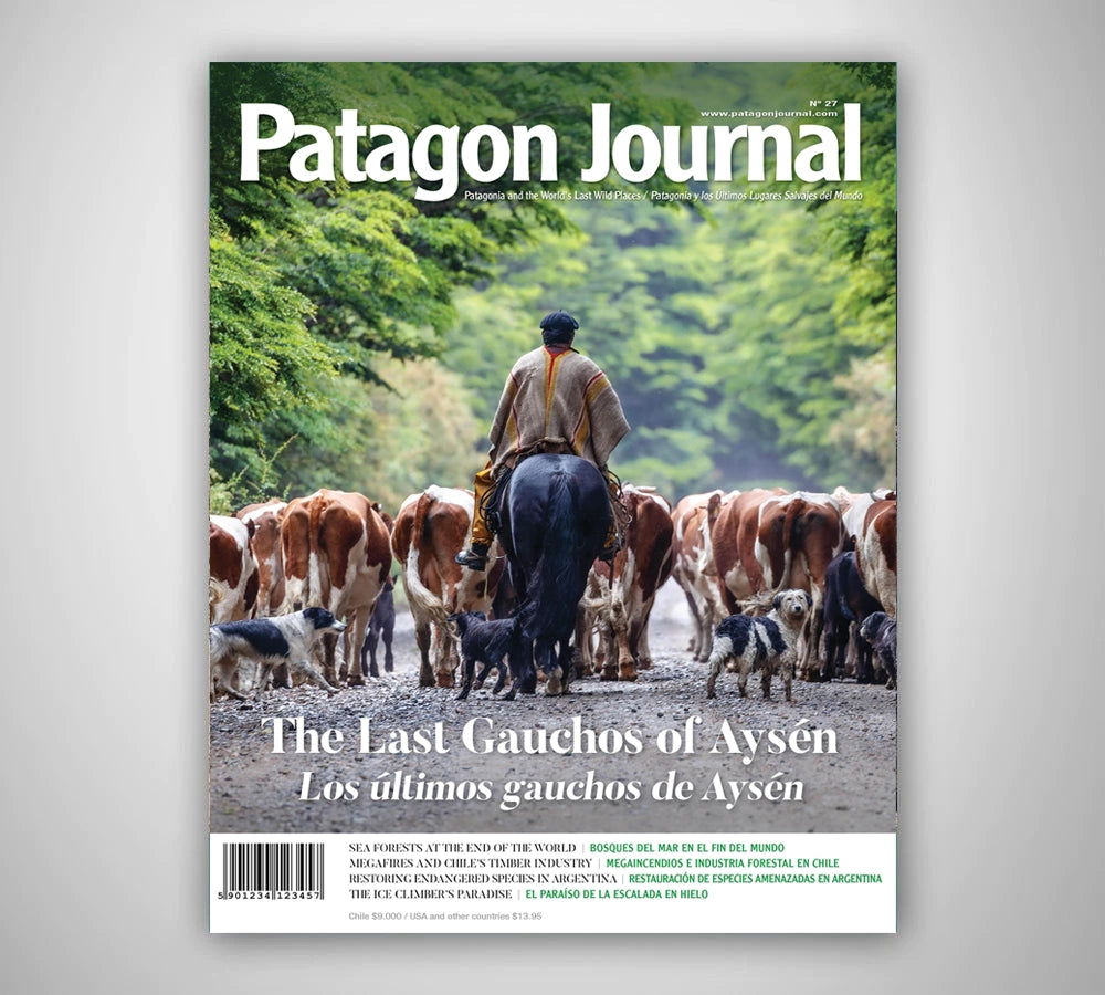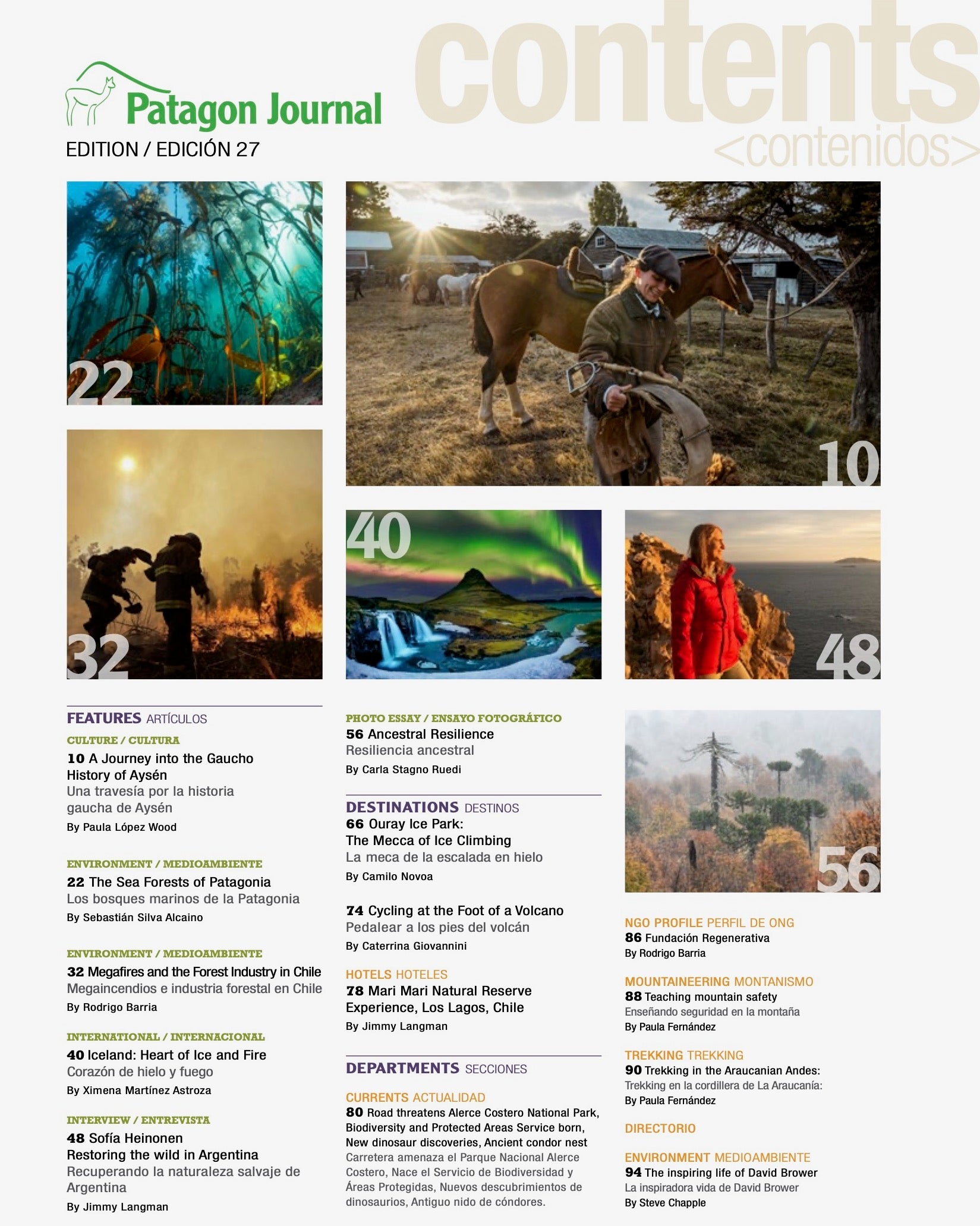 In our cover story, Paula López Wood writes about the gaucho life in Patagonia and how Aysén residents are trying to revitalize their rural culture. Also in Issue 27, we have a report from Sebastián Silva Alcaíno on the sea forests at the end of the world; Rodrigo Barría writes about megafires and how tree plantations in Chile are combining with climate change to fuel them; Ximena Martínez Astroza writes about visiting Iceland’s natural wonders; Jimmy Langman interviews Sofia Heinonen about her work at Rewilding Argentina; we have a photo essay from Carla Stagno Ruedi about the ancient araucaria trees; Camilo Novoa files a dispatch about possibly the world’s best ice climbing park; and much more.