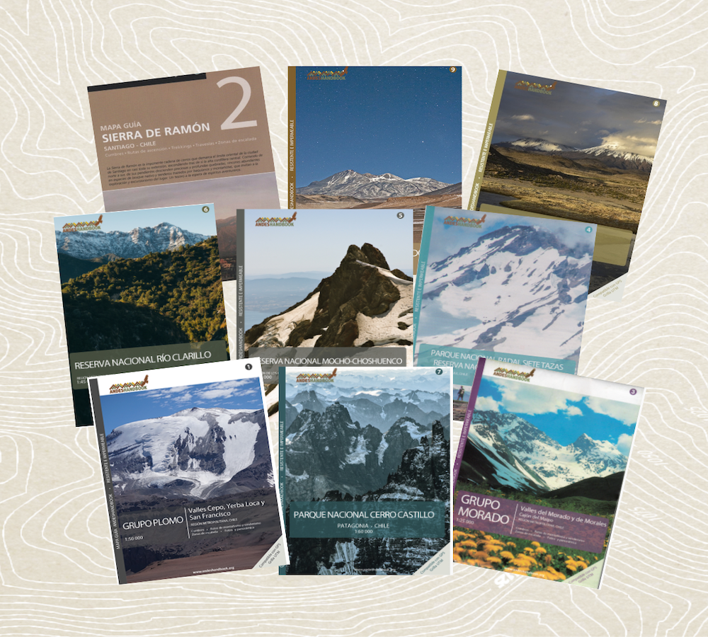Este pack de 5 guías de mapas incluye 5 de las siguientes guías a elegir: Grupo Plomo, Grupo Morado, Parque Nacional Río Clarillo, Parque Nacional Cerro Castillo, Reserva Nacional Mocho-Choshuenco, Nevado Ojos del Salado o Parque Nacional Lauca.